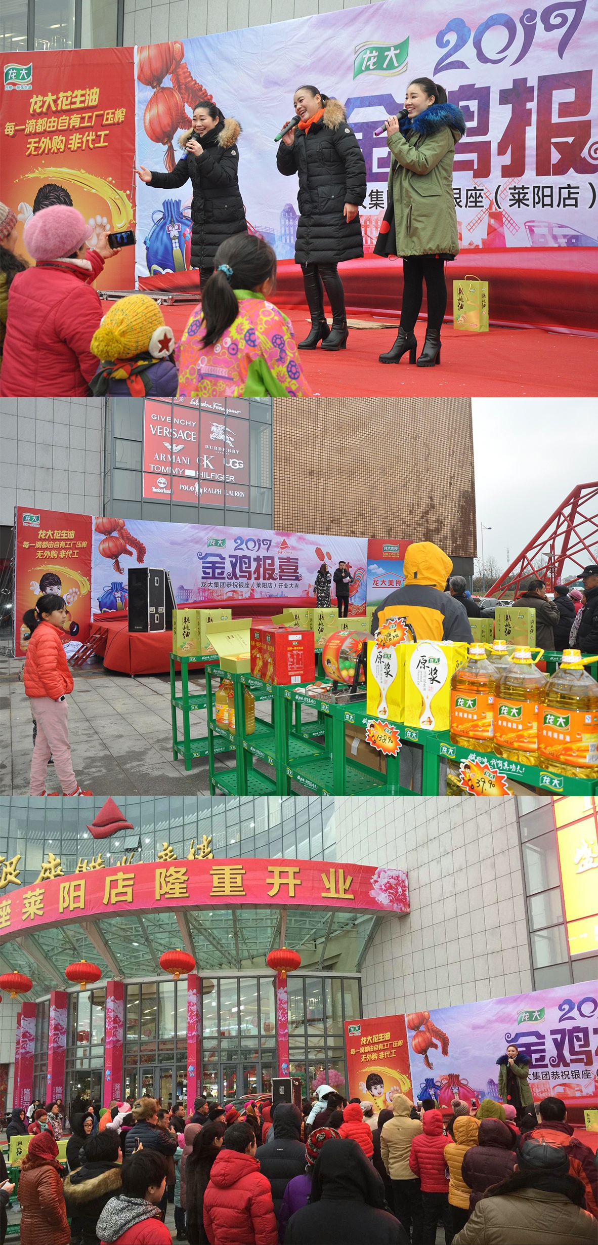 1月7日—9日,銀座萊陽店門前廣場喜氣洋洋。龍大集團(tuán)組織旗下植物油、肉食品兩大內(nèi)貿(mào)產(chǎn)品進(jìn)行為期3天的路演,為銀座萊陽店開業(yè)助力。