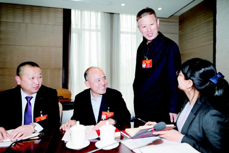 3月9日,山東代表團周建軍(左一)、周洪江(右二)等代表討論宮明杰代表(左二)提出的提高經(jīng)濟作物種植機械化程度的建議。
