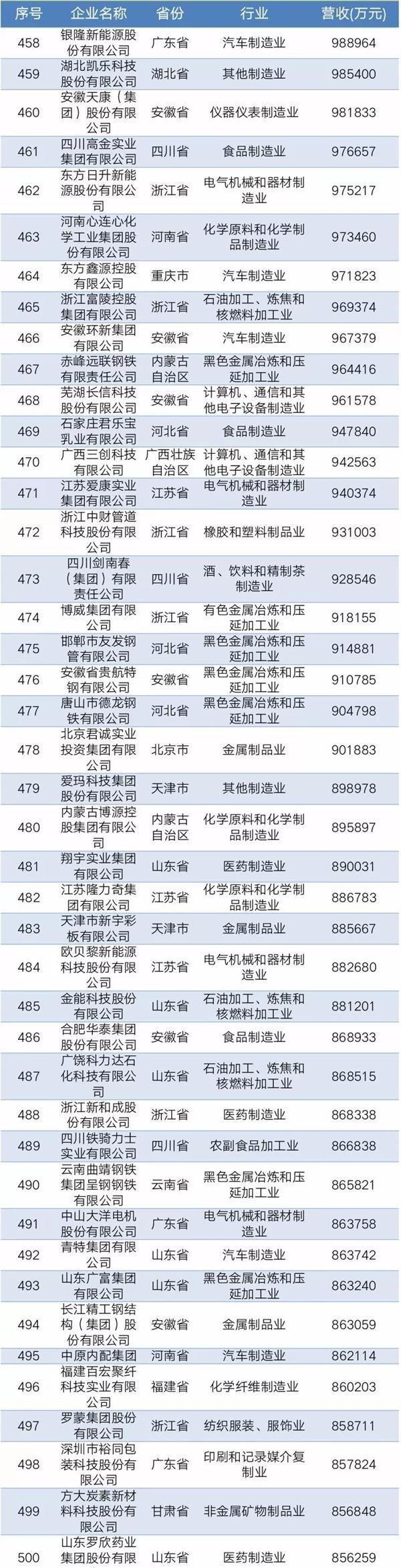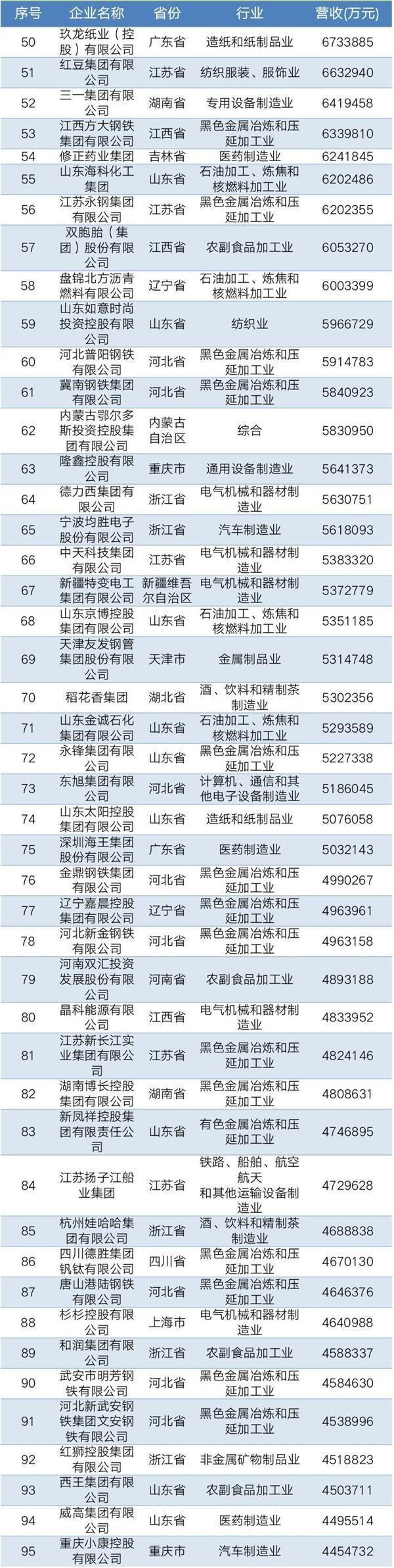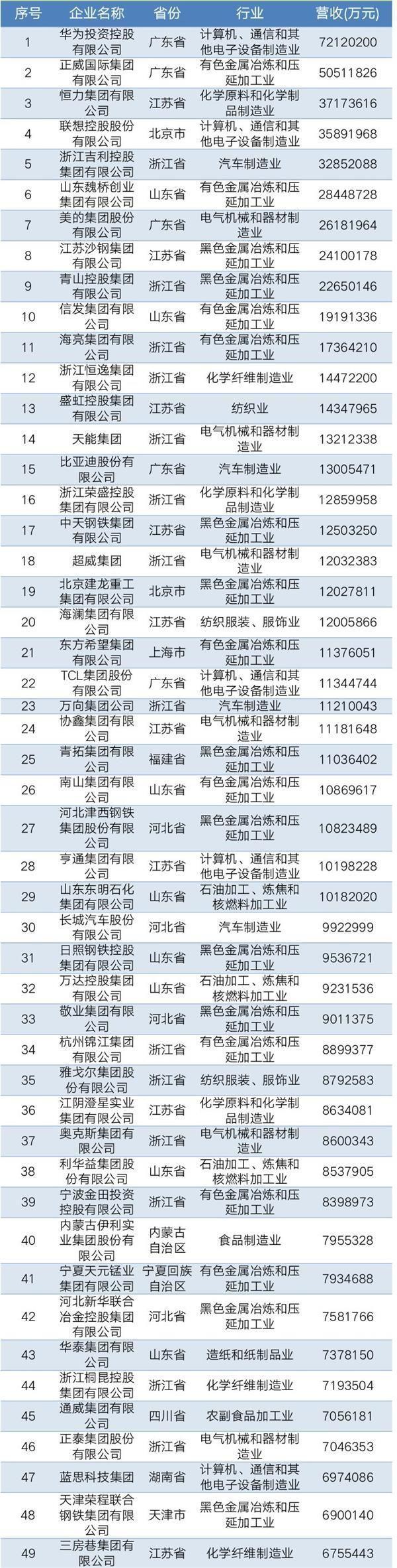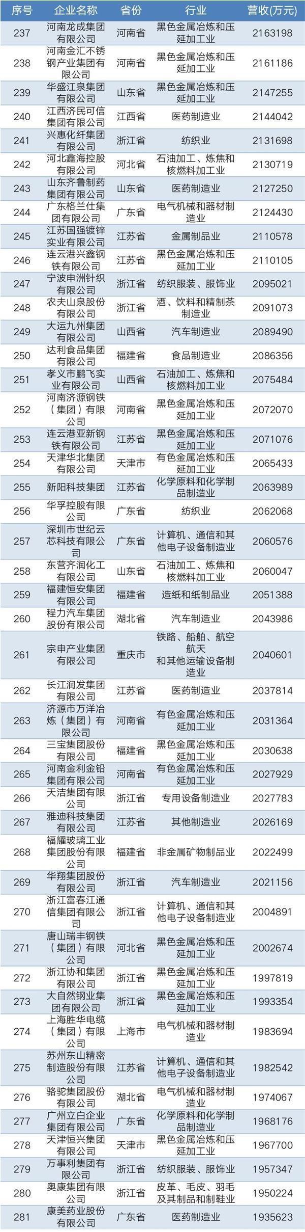 2019年中國民營企業制造業500強名單