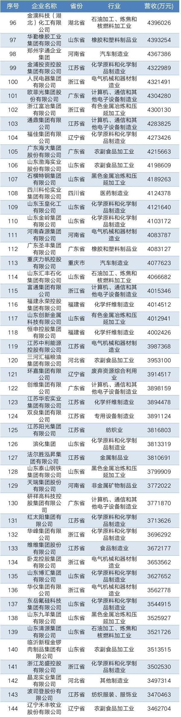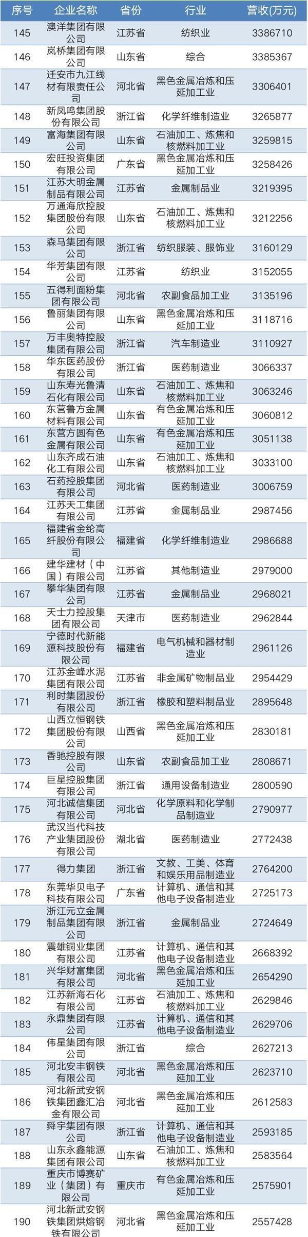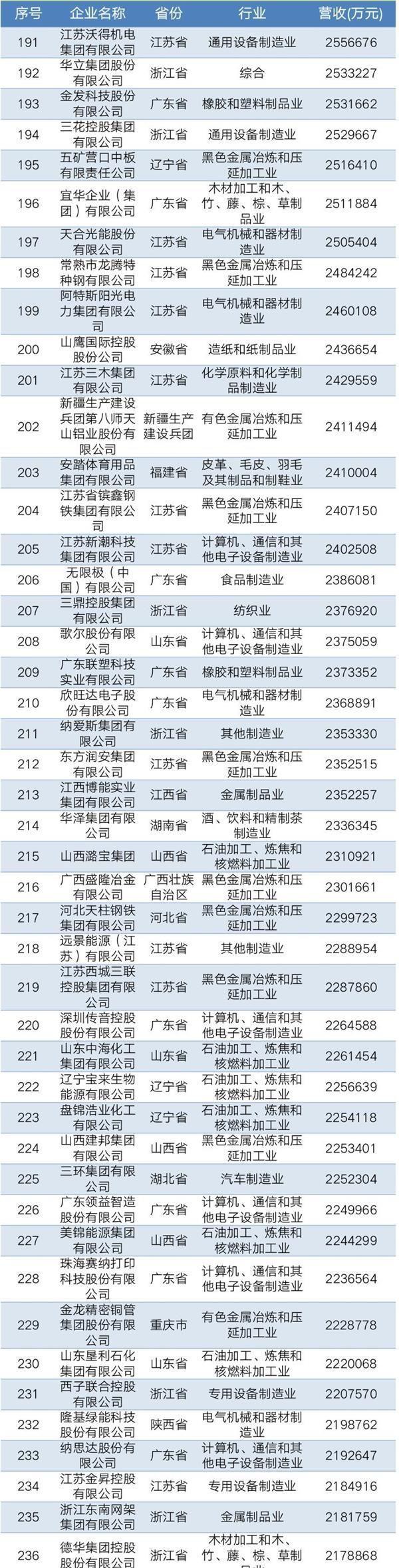 2019年中國民營企業制造業500強名單