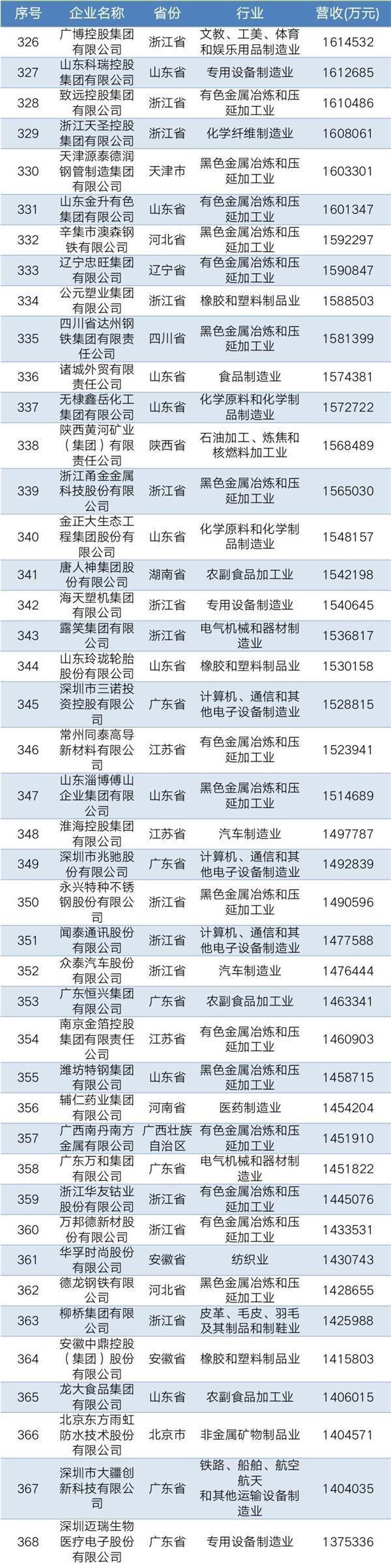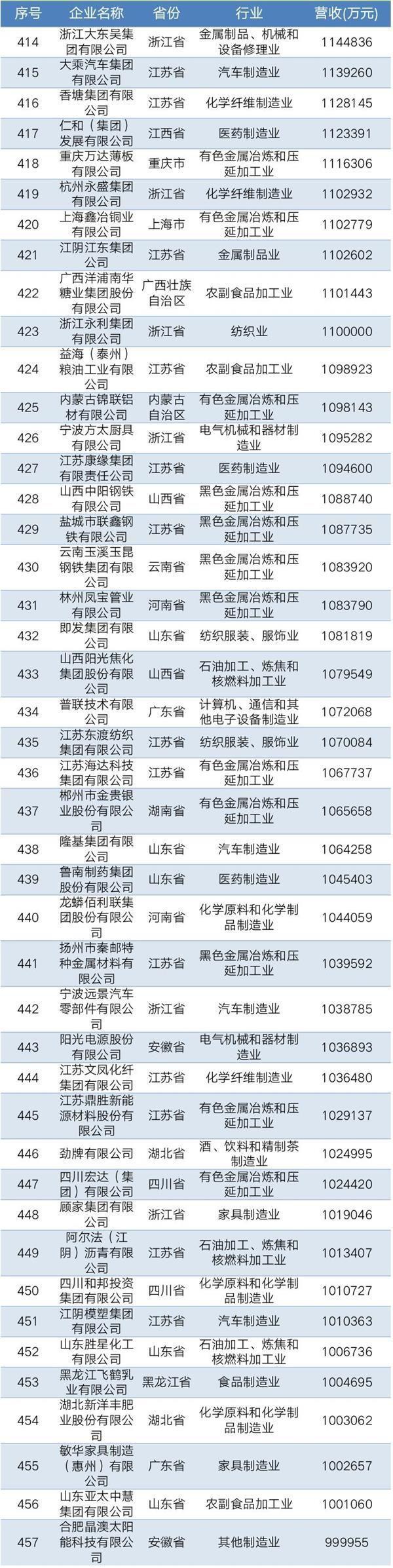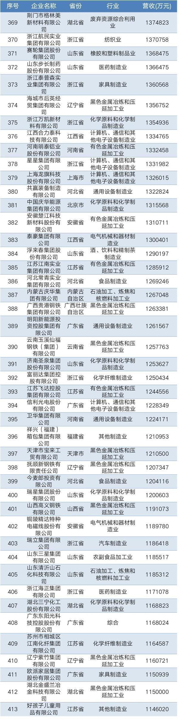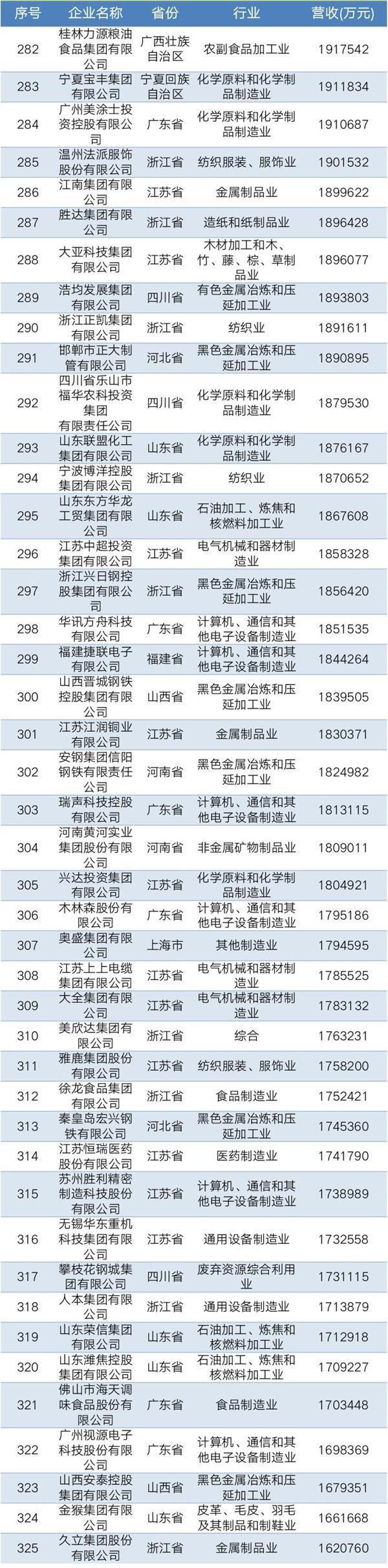 2019年中國民營企業制造業500強名單