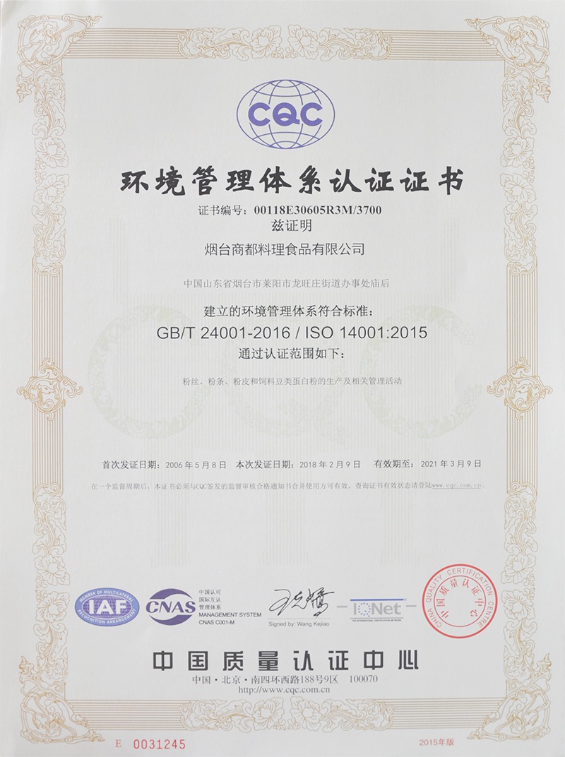 近日,CQC中國質量認證中心山東評審中心評審組在龍大食品工業園對煙臺商都料理食品有限公司的環境管理體系進行驗收。