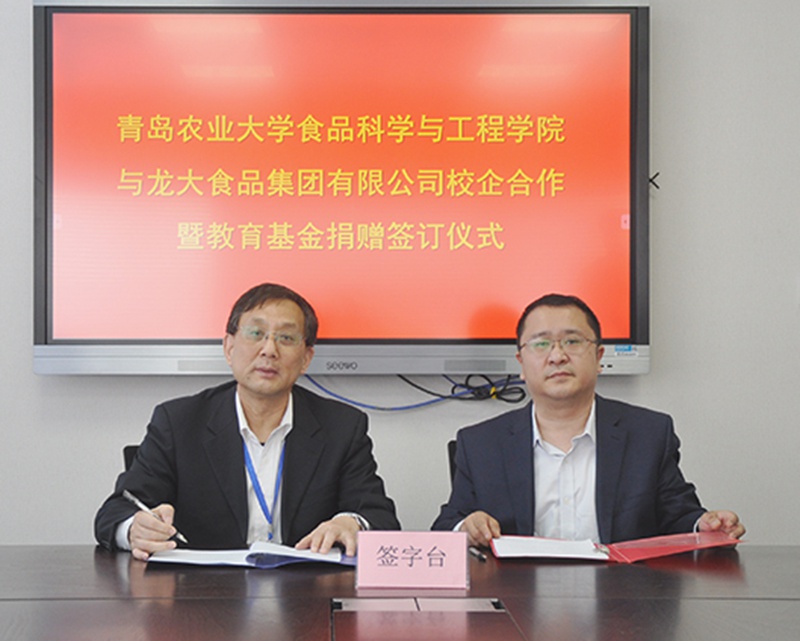 4月21日,龍大食品集團有限公司與青島農業大學校企合作簽約儀式在龍大集團總部舉行。龍大集團總經理張德潤、青島農業大學食品科學與工程學院院長王寶作為雙方代表在合作協議上簽字。