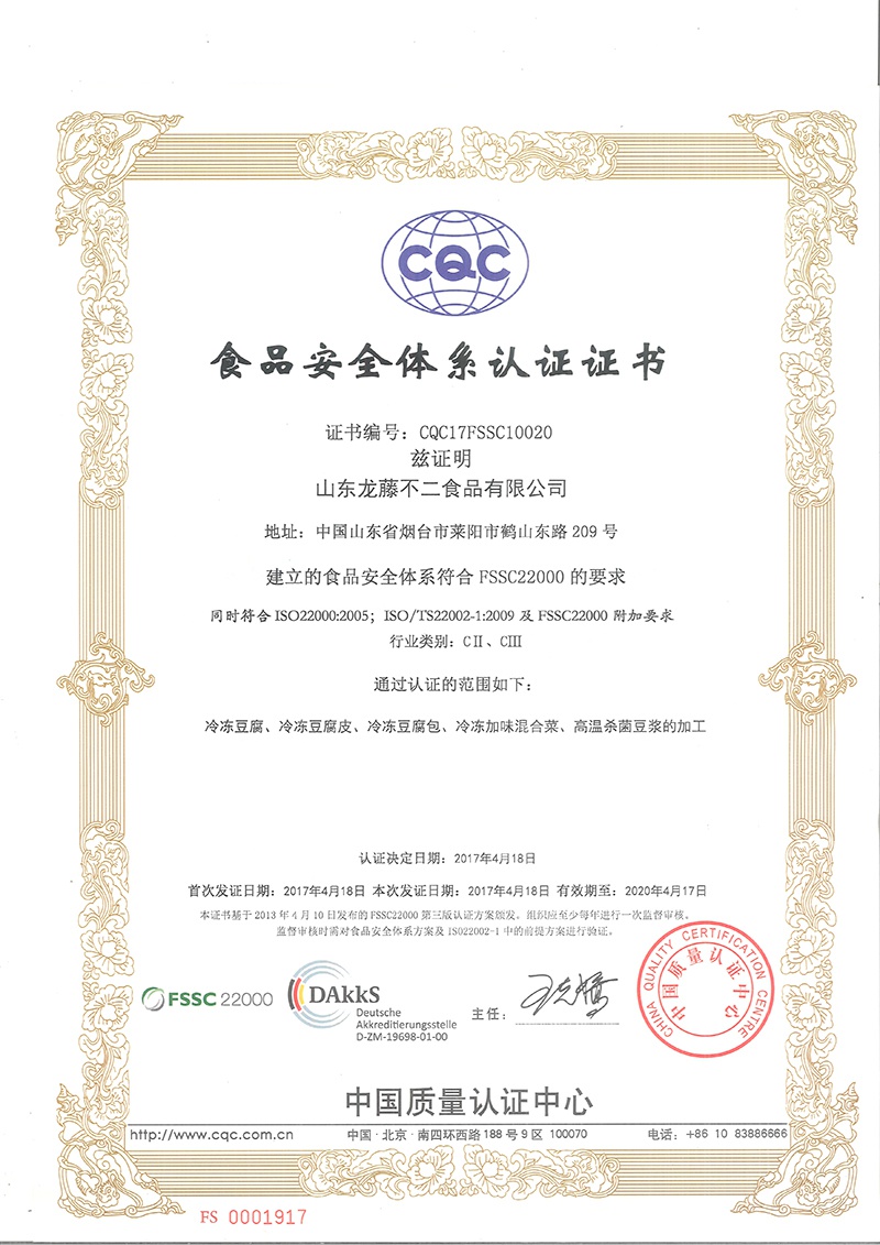 日前,山東龍?zhí)俨欢称酚邢薰精@得由中國質(zhì)量認(rèn)證中心頒發(fā)的《食品安全體系認(rèn)證證書》。這一證書的頒發(fā),意味著龍?zhí)俨欢镜氖称钒踩芾硭秸脚c國際高標(biāo)準(zhǔn)的食品安全管理水平接軌。